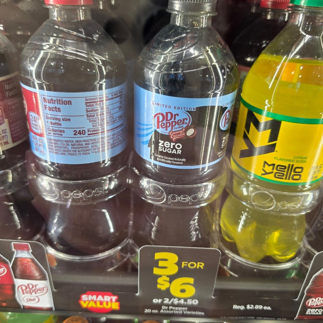 | Fri 17:31 |  | 20 ounce bottle of Dr Pepper Creamy Coconut Zero Sugar |